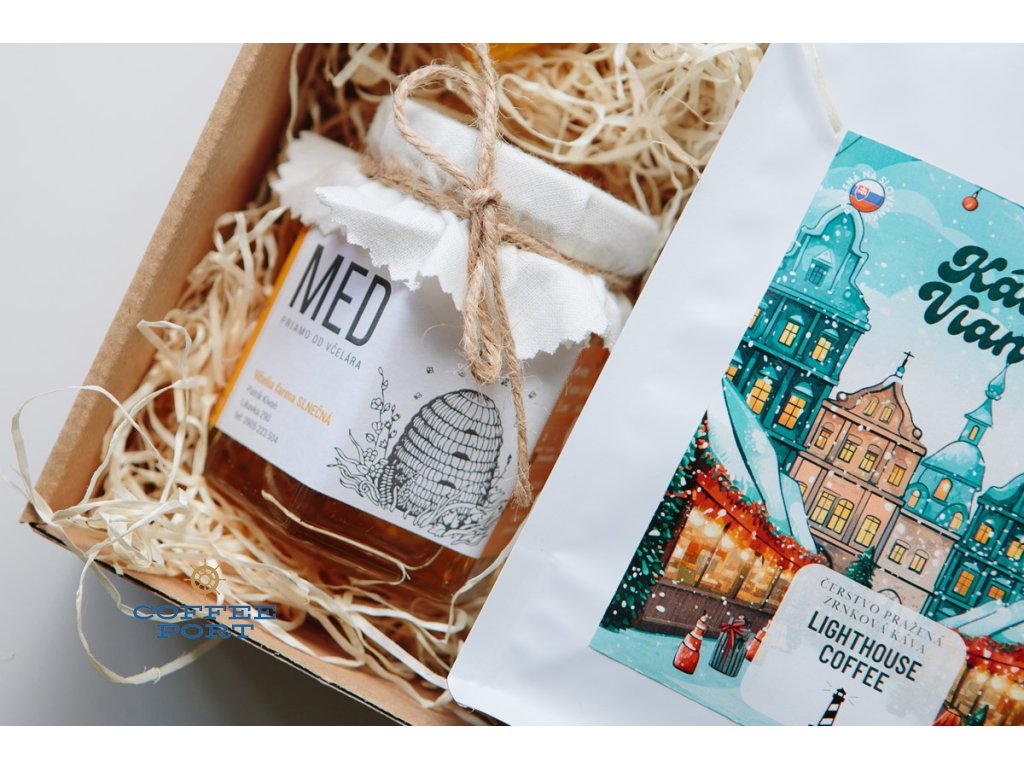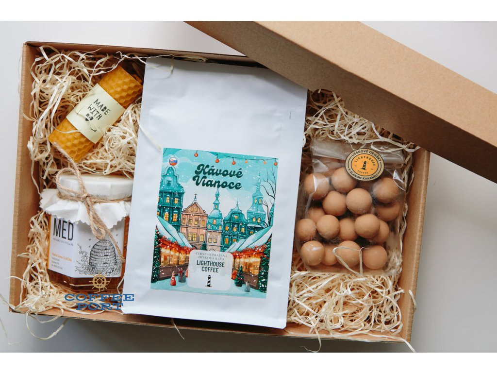 Lighthouse Coffee Vianočná káva & lieskové oriešky v slanom karameli & med a sviečka od včelára: darčekový balíček