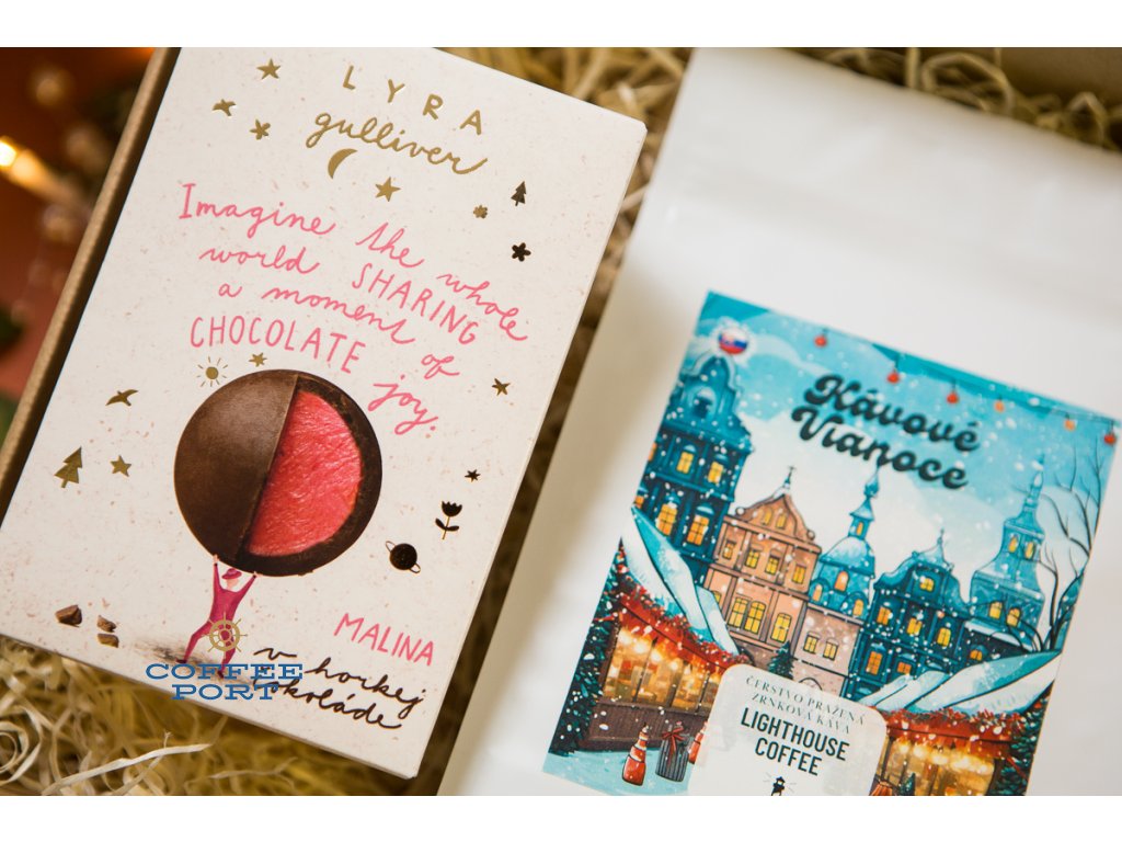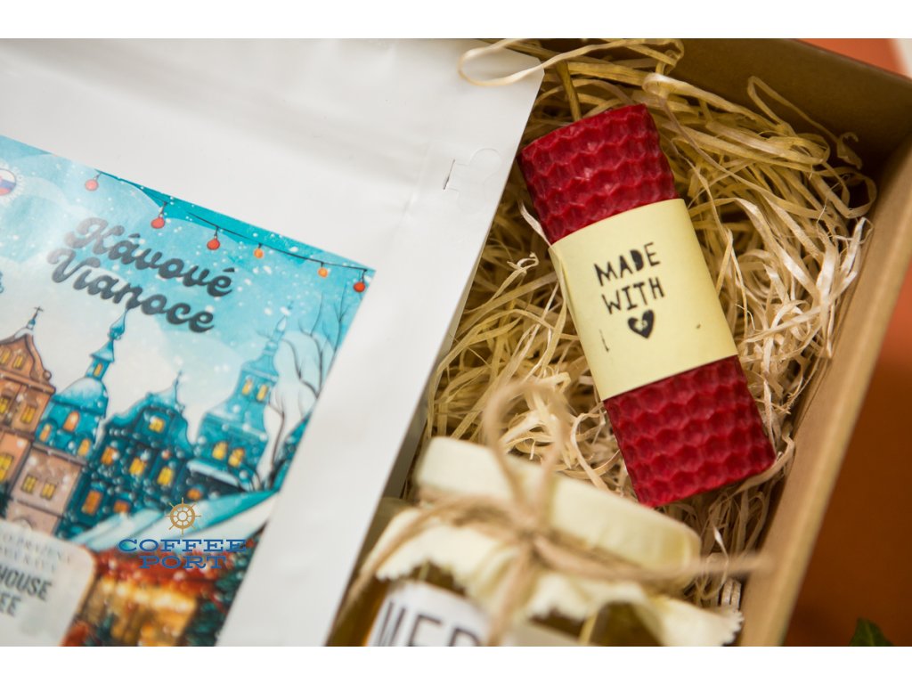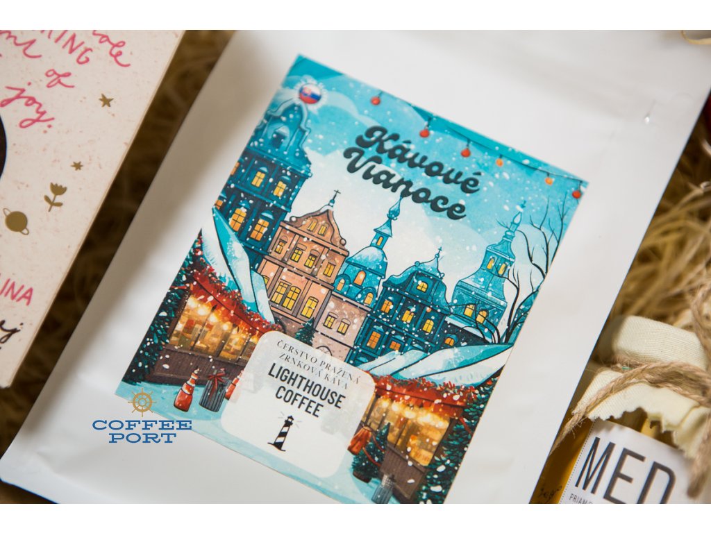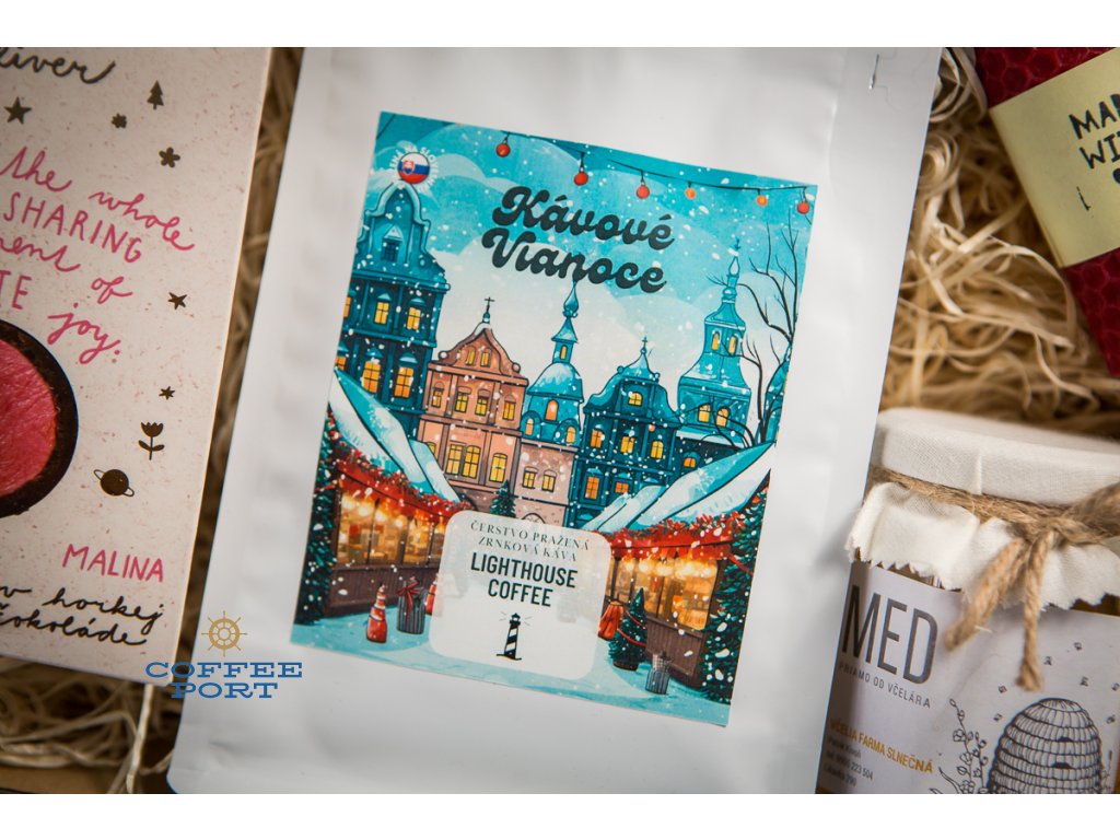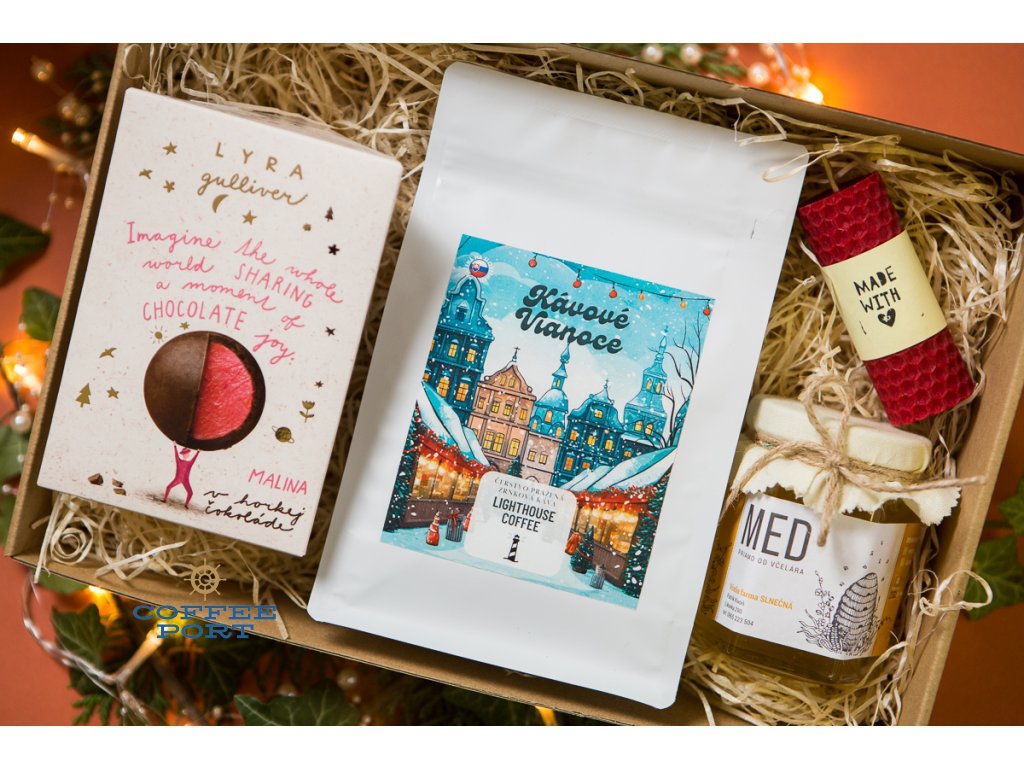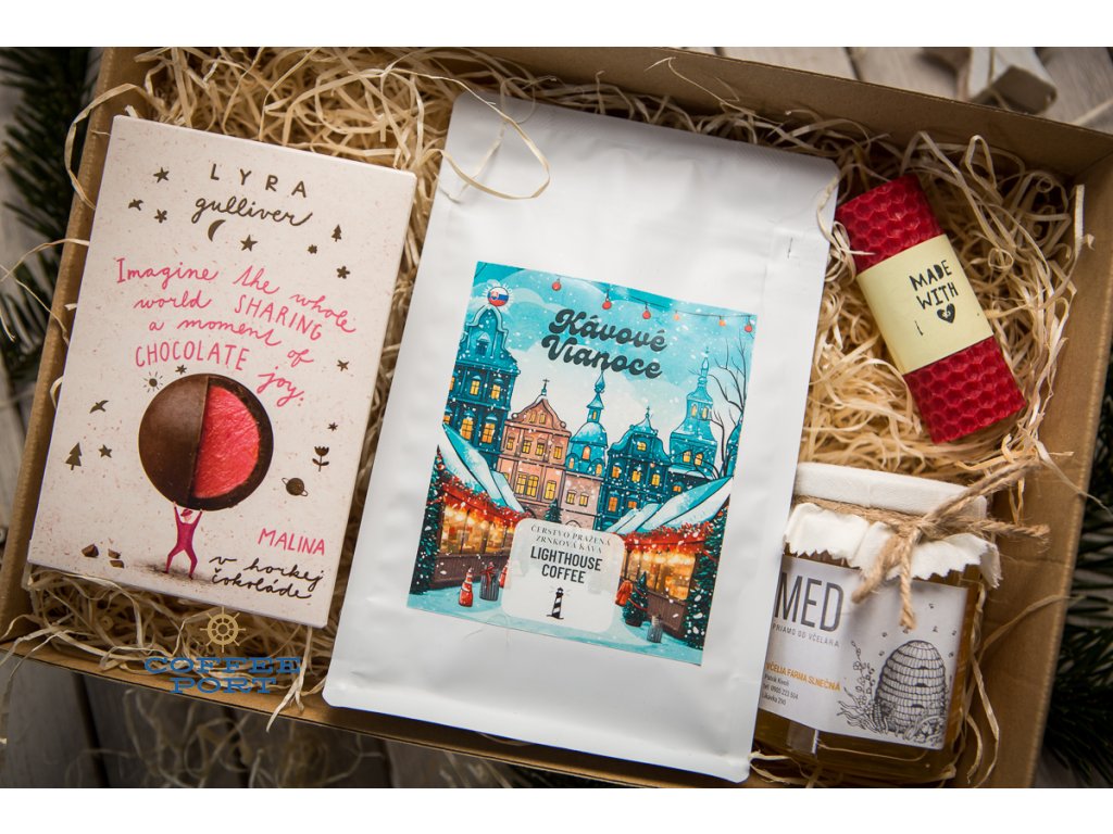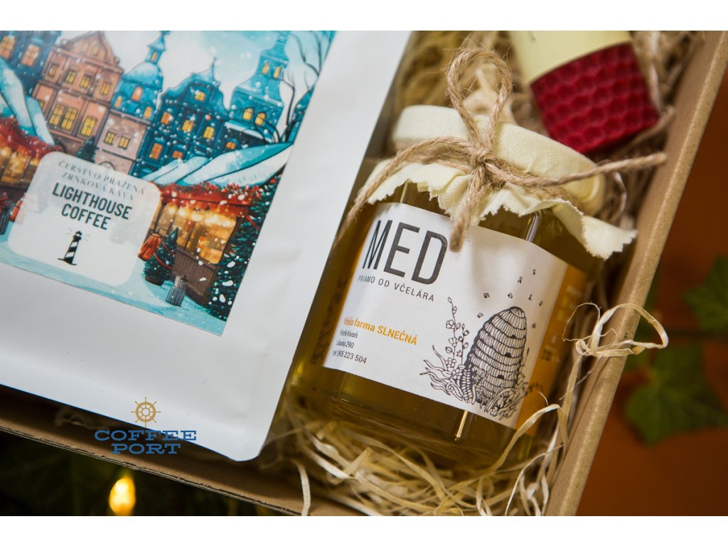 Lighthouse Coffee vianočný balíček & Lyra Gulliver & sviečka a med priamo od včelára: darčekový balíček
