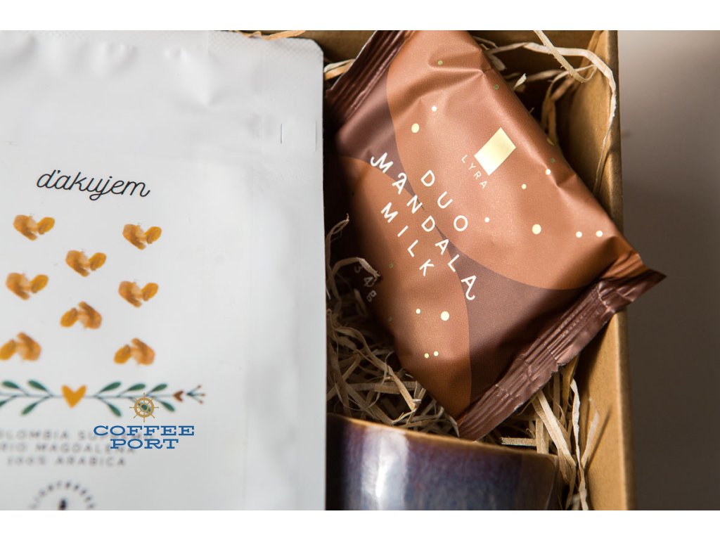 Zrnková káva Lighthouse Coffee Ďakujem & keramická šálka & čokoláda Lyra Duo Mandala: darčekový balíček